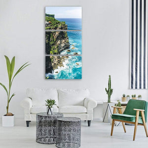 This canvas depicts coastal cliffs, the open sea, crashing waves, rocky shorelines and coastal vegetation. The composition uses depth and rule-of-thirds balance to create a serene, natural, majestic mood, with small buildings perched on the cliff tops. Suits modern or nature-inspired rooms as a calm, natural focal point.