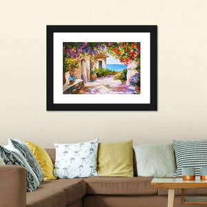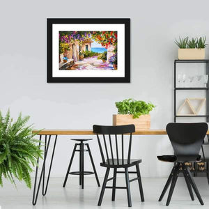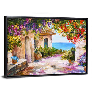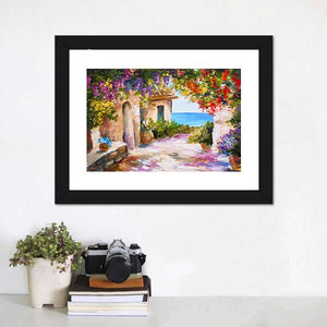 This vibrant canvas art features a serene sea view with a charming house, complemented by colorful flowers and a winding village path. The impressionistic style captures a summery atmosphere, perfect for bringing warmth to your space.