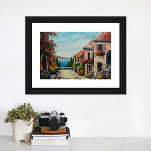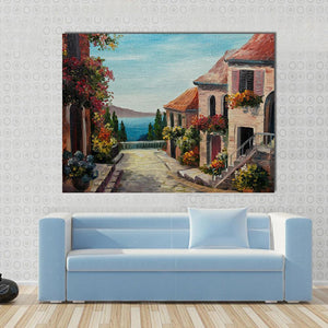 This impressionistic canvas art captures a charming coastal town with cobblestone streets and vibrant buildings bathed in sunny light. The serene palette of blues, ochres, and greens evokes a tranquil atmosphere, making it an inviting addition to your home decor.