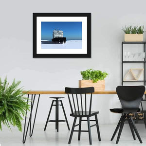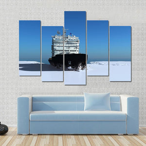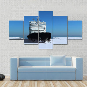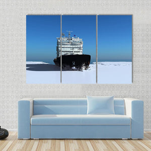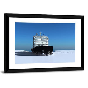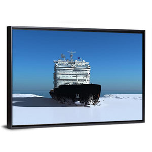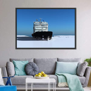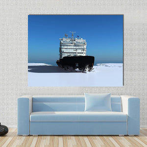 This canvas art features a dramatic depiction of an icebreaker ship navigating through the icy Arctic. With a photorealistic style, it captures the vast, challenging environment, accentuated by shades of blue and white against the ship's black hull.