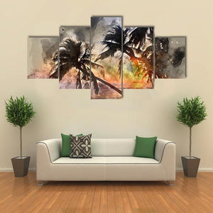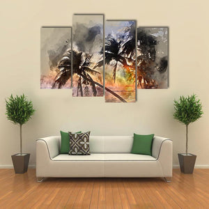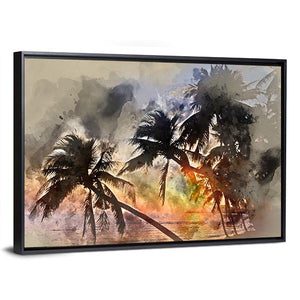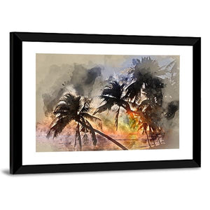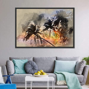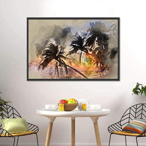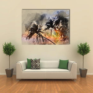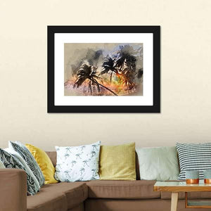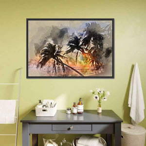 Palm trees and a sunset over a beach form an abstract, watercolor landscape with a dramatic yet serene, warm feel. The piece uses a warm palette of orange and yellow with brown, gray and black accents and a watercolor effect on the fronds and clouds, making it a natural fit for modern or coastal rooms.