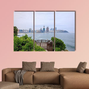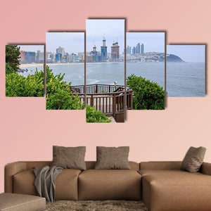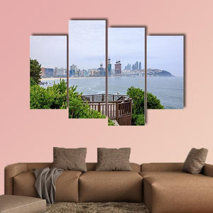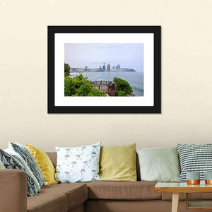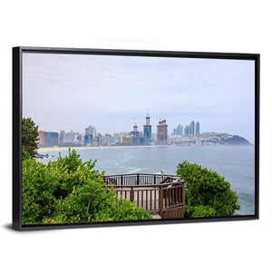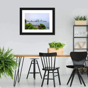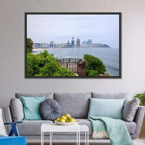 Island of Camellias In Busan shows a coastal cityscape with ocean, deck, and foliage framed beneath an overcast sky. Rendered in a photorealistic, naturalistic style with blue-green and gray tones, it creates a peaceful, scenic mood and suits modern or coastal living spaces.