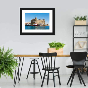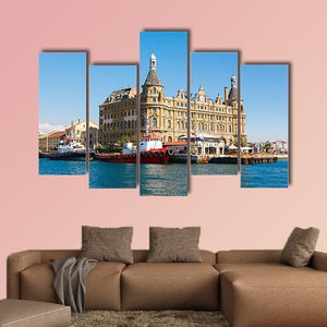 Haydarpasa Train Station Canvas Wall Art captures the historic train station beside calm water with tugboats in a photorealistic cityscape. The clear, bright palette of blues, tans, whites and touches of red gives the scene a historical, serene feel. It works well in modern living rooms and offices as a cityscape focal point.