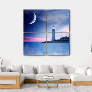 This canvas features a glowing lighthouse under a serene night sky, where a crescent moon and stars illuminate the ocean waves. Its peaceful and dramatic vibe suits any modern coastal decor.