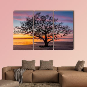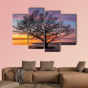 A photorealistic landscape showing a lone live oak with bare branches on the shore, calm water and a colorful coastal sunset. The orange, pink and blue tones give a tranquil, serene feeling. Suited to coastal or modern room decor that favors peaceful nature scenes.