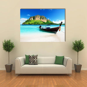 Experience the tranquil beauty of a tropical island with our Boat On Poda Island canvas wall art. This vibrant piece captures a longtail boat tied to the shore, surrounded by lush green vegetation and a serene ocean backdrop, perfect for adding a touch of nature to your space.