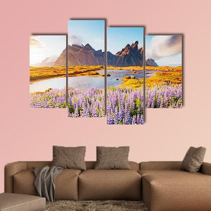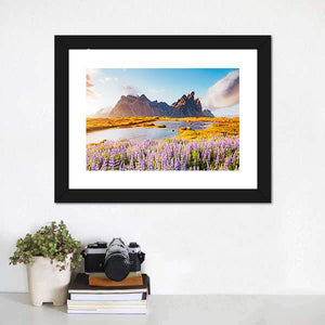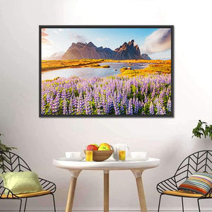 A field of purple lupine flowers fills the foreground with a body of water and rocky mountains beyond. This nature-photography scene reads as serene and vibrant, making a picturesque addition to modern room decor.