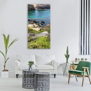 Malta Sea In Summer Canvas Art shows a quiet coastal scene: an old weathered boat hull resting on mossy rocks beside clear turquoise water. The realistic landscape feels serene and rustic, with blues, greens and earth tones that calm a room. It suits coastal or nature-inspired rooms and modern decor.