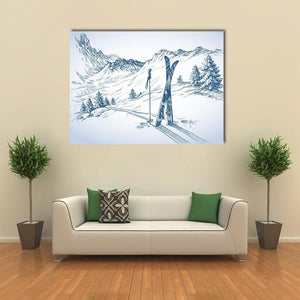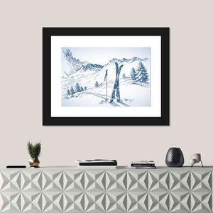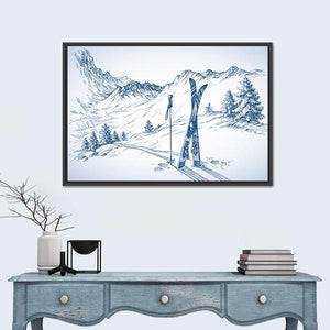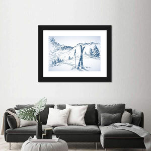 This artwork features a serene snowy landscape with majestic mountains, pine trees, and skis set against a tranquil winter backdrop. The pen and ink sketch style offers a vintage feel, perfect for evoking a peaceful atmosphere in any room.