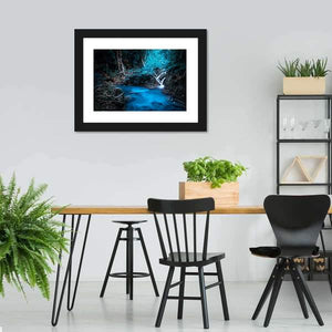 A landscape canvas of a deep tropical rain forest with a cascading waterfall and glowing turquoise water. Blues and greens give the scene a serene, cool, slightly magical mood with dense foliage and a clear sense of depth. Suits modern living rooms or bedrooms that need calm, natural color.