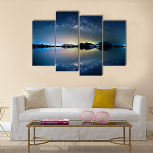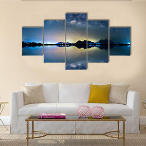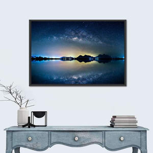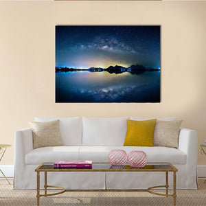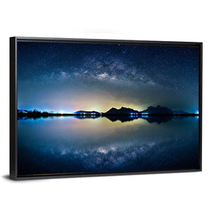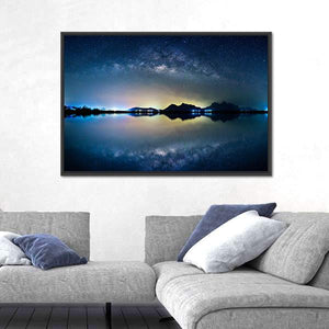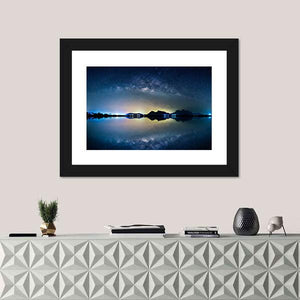 A photorealistic landscape of the Milky Way and night sky arching over mountains, mirrored in a calm lake. Sharp stars and a band of glowing lights on the horizon create a serene, awe-inspiring mood that suits modern living rooms or bedrooms.