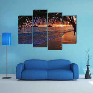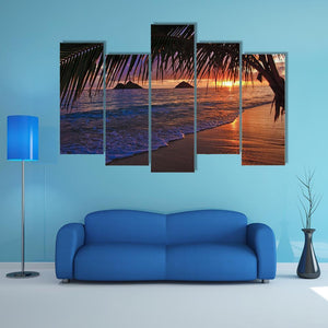 Capture the serene beauty of Lanikai Beach with this canvas wall art, showcasing gentle waves, palm fronds, and two distant islands. Its warm colors and realistic style bring a tranquil atmosphere to any space.