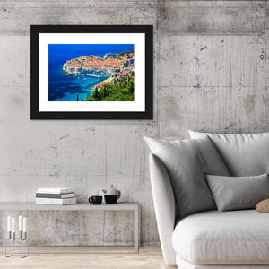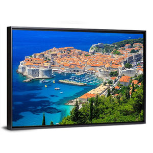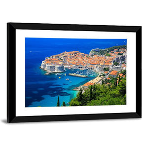 Panoramic View Of Old Town Dubrovnik shows a high-angle coastal city scene with the harbor and sea. The realistic artwork highlights red-tiled roofs, stone walls, boats in the harbor and cypress trees in a sunny, serene and vibrant palette of blue, orange, green and white. It fits modern or coastal-inspired rooms as a calm scenic focal point.