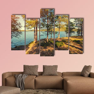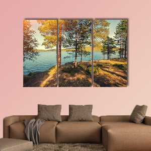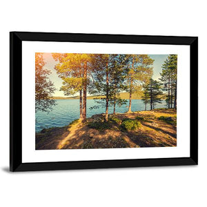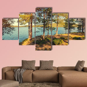 Pine Trees Near Sea In Finland shows pine trees along a lakeshore with sunlight filtering through the trees and rippling water. The blue, green, brown and yellow palette creates a calm, serene mood that works well with modern or rustic room decor.
