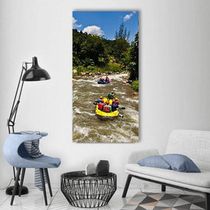 This realistic landscape captures river rafting on white water rapids, with two rafts, lush trees, and distant mountains. Greens, blues, browns, and whites convey a natural, adventurous, and vibrant daytime scene in motion. Works well as nature-themed or modern wall decor.