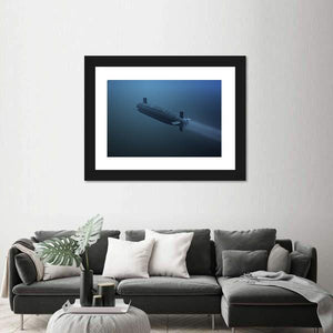 This canvas art features a striking rear view of a submarine moving through dark blue waters, evoking a mysterious and powerful atmosphere. The diagonal composition and propulsion wake add depth to any modern space, making it a compelling piece of wall decor.