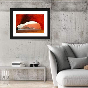 A photorealistic view through a textured red rock arch onto the Atlantic coast at sunset, with distant rock formations and calm water. Warm orange, red and tan tones create a peaceful, natural mood that fits modern homes and coastal-inspired room decor.