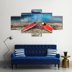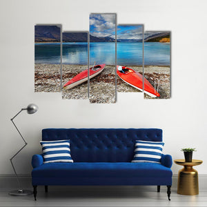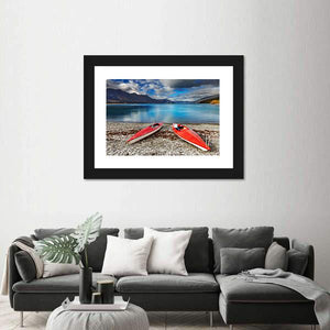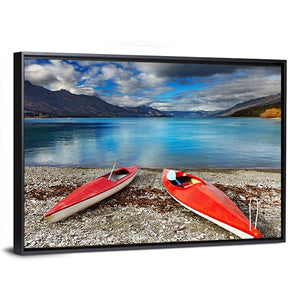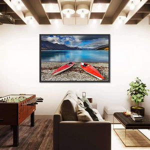 This canvas art features two red kayaks resting on a rocky shore, set against a tranquil lake and distant mountains. The striking blue water and cloudy sky create a serene atmosphere, making it a lovely addition to your home decor.