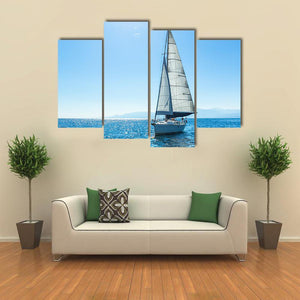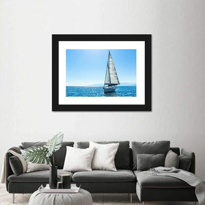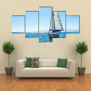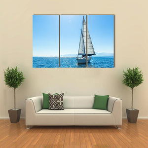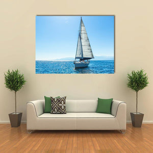 Experience the serenity of a sailboat gliding across a sparkling sea, framed by distant mountains under a clear blue sky. This realistic canvas art adds a calm, coastal vibe to any space.
