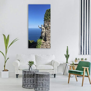 A draped male statue looks out over the ocean beside an ivy-climbing stone wall in Capri, Italy. The realistic landscape uses blues, greens, greys and tan to create a serene, historic, majestic mood. It fits well in modern or coastal-themed rooms that favor nature and places-themed art.