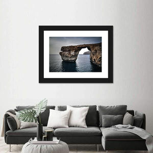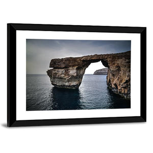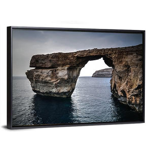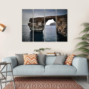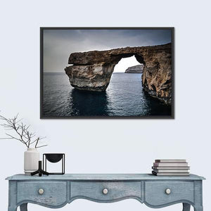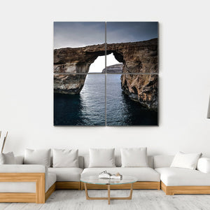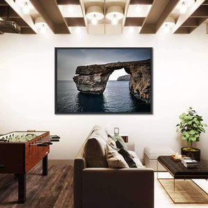 This captivating canvas art features a rocky natural arch over a serene sea, framed by layered cliffs. The photorealistic style showcases a harmonious palette of blue, brown, gray, and white, creating a majestic and calming presence in any space.