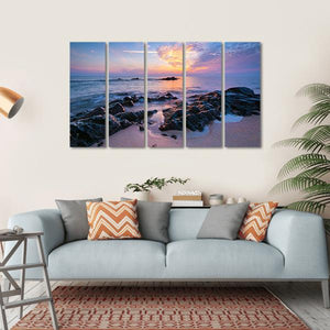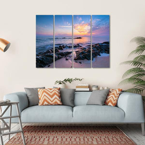 This canvas art captures a serene ocean sunset, showcasing a rocky shoreline and dramatic clouds. Its colorful palette of blues, oranges, and purples adds a majestic touch to any space.