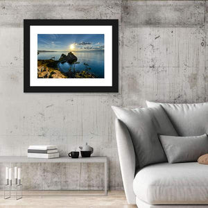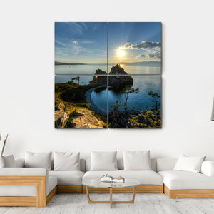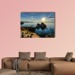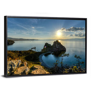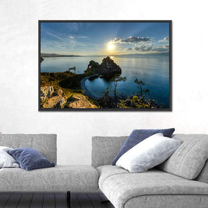 This captivating canvas artwork features a stunning rock formation against the serene backdrop of Lake Baikal. Bathed in golden hour sunlight, the piece evokes a sense of majesty and tranquility, perfect for enhancing any nature-inspired décor.