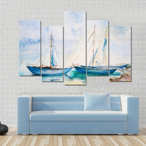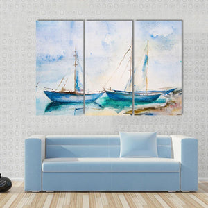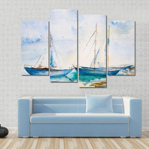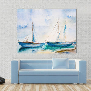 Featuring two sailboats on calm water under a cloudy sky, this watercolor artwork evokes a serene and tranquil atmosphere. Its soothing palette of blue, teal, and white makes it a lovely addition to any wall decor.