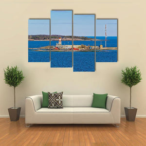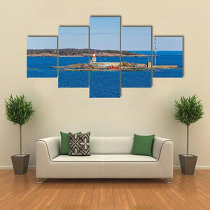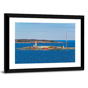 This landscape artwork features a serene scene of a small island in Finland, showcasing a striking red and white lighthouse amidst a calm sea and clear sky. The soothing palette of blue and white enhances its tranquil vibe, making it a lovely addition to your wall decor.