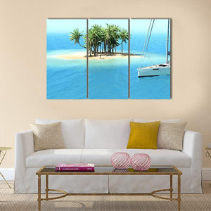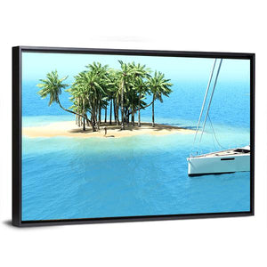 This canvas art captures a serene tropical scene featuring a single snorkeler near a palm-fringed island. The tranquil blues and greens evoke feelings of peace and relaxation, making it a lovely addition to any space.