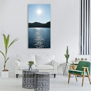 Solar Reflection In Summer shows sunlit water, rolling hills, and a bright summer sky, with sun glare dancing across the surface. Rendered in blues, greens, yellows, and white with a modern rule-of-thirds composition, it creates a calm, serene, bright atmosphere suited to modern, nature-inspired rooms.
