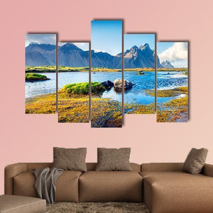 Stokksnes Headland Canvas Wall Art depicts a serene mountain-and-lake landscape with jagged peaks, grassy shoreline and reflective water. Muted blues, greens, yellowish-green vegetation and greys create a calm, natural mood. Suited to modern or nature-inspired rooms, it makes a tranquil focal point for home wall decor.