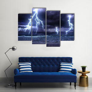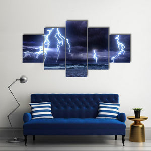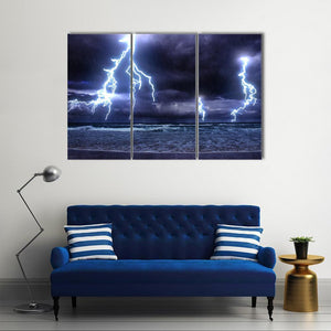 This dynamic canvas wall art captures the intensity of a stormy sea, featuring dramatic lightning strikes amidst dark clouds. The powerful scene, beautifully divided between the crashing waves below and the ominous sky above, adds a striking presence to any space.