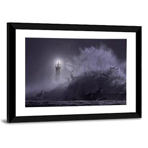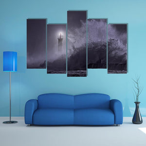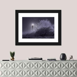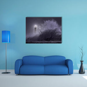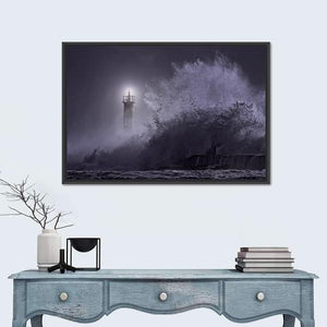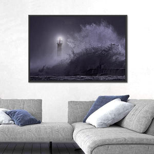 A lighthouse and storm-driven ocean waves form a dramatic night landscape with a clear lighthouse beam and intense motion. Rendered in purple, gray, white and black, this canvas print carries a powerful, moody energy that suits modern interiors.