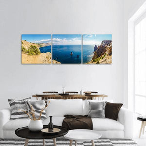 Summer Seascape In Russia captures coastal cliffs and the open ocean, with two sailboats drifting beneath white clouds. The realistic panoramic composition uses blue, tan, green, and white to create a serene, vast, and tranquil mood. It fits modern and coastal-themed rooms as calm wall decor.