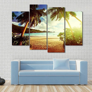 This canvas depicts a serene beach scene, featuring gentle waves and palm trees under a partly cloudy sky. The bright blues and greens create a vibrant, tropical vibe, making it a delightful addition to your wall decor.