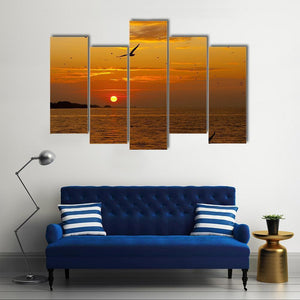 Sunrise With Seagull Canvas Wall Art features a sunlit ocean scene with an island silhouette and numerous birds in flight, offering a serene, majestic landscape. Warm gold, orange and blue tones add depth and calm, making it a natural fit for modern living rooms or bedrooms seeking nature-inspired wall decor.
