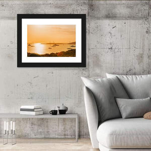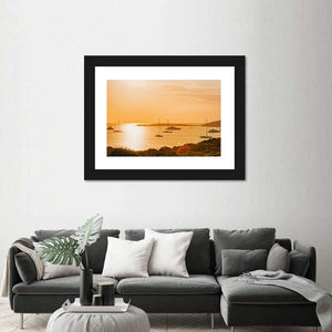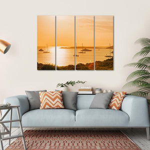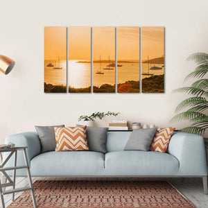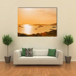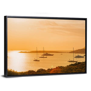This canvas wall art captures the serene beauty of a sunrise over the calm waters of Porto Rotondo, featuring several sailboats and yachts gently docked. With warm hues of orange and gold against a peaceful ocean backdrop, it adds a tranquil touch to any space.