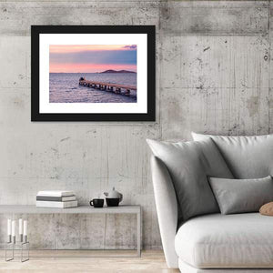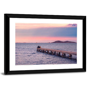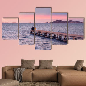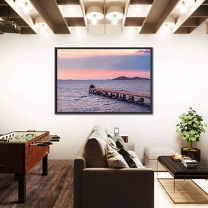 This impressionistic canvas depicts a jetty with two silhouetted figures against a pink-and-blue sunset over the ocean and nearby islands, creating a calm, romantic atmosphere. Soft purples and warm browns blend into the sky and water, making it a natural fit for modern living rooms or bedrooms seeking serene wall decor.
