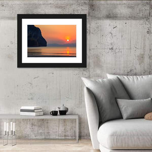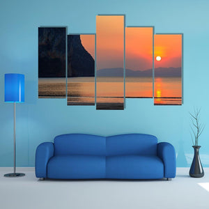 Sunset Of Pak Meng Beach shows a peaceful, warm evening as the sun sinks over the ocean at Pak Meng Beach in Thailand, its light reflecting on calm water beside a large rocky cliff. Rendered in a modern, minimalist palette of orange, blue and gray, the landscape fits modern home decor and room displays.