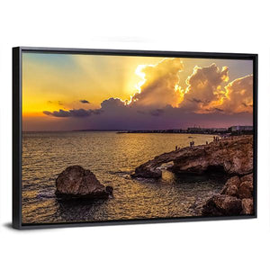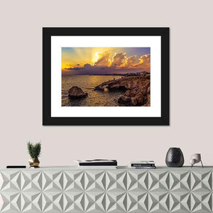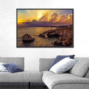 A panoramic view of an ocean sunset off the coast of Cyprus, showing a rocky coastline, drifting clouds and silhouetted figures on the rocks. Rendered in orange, yellow, purple and brown tones, the image has a dramatic, modern feel and works well as wall decor in modern interiors.