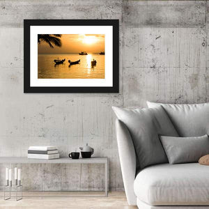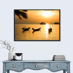 This serene canvas art captures a stunning sunset over calm waters, featuring silhouetted palm fronds and boats peacefully floating. The warm hues of orange, yellow, and brown evoke a tranquil atmosphere, making it a perfect addition to your wall décor.