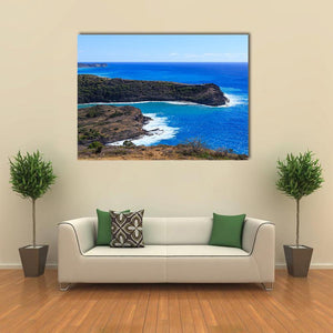 This captivating artwork features a breathtaking coastal view of Antigua, showcasing the ocean's foaming waves crashing against rocky cliffs. The serene palette of blue and green hues captures nature’s beauty, bringing a tranquil atmosphere to any space.