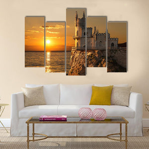 Swallows Nest Castle Canvas Wall Art shows a gothic-style castle perched on a cliff above a calm sea at sunset, highlighted by sunbeams and rippling water. The realistic scene feels serene and romantic and suits modern or coastal interiors.