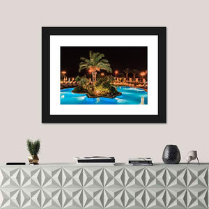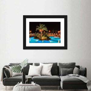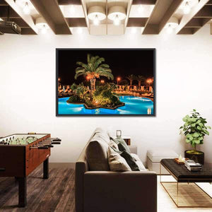 A realistic night scene of a tropical island with palm trees, centered in a glowing swimming pool and softly illuminated against the dark sky. Blue, green, yellow and black tones create a calm, tropical-night mood that fits modern or tropical-inspired rooms.