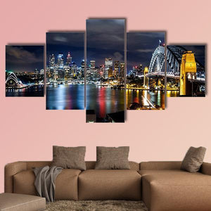 Sydney Harbor and downtown buildings are shown as a modern cityscape, with illuminated bridge arches and skyline reflections in the harbor. Nighttime blues and blacks mix with yellow and white highlights for a vibrant, nocturnal mood that works well on contemporary living room or office walls.