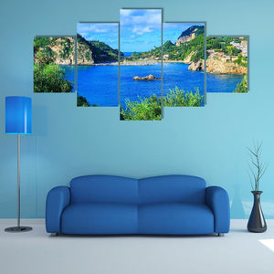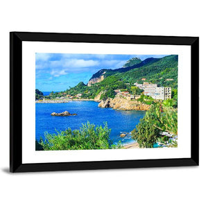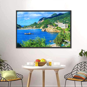 A photographic canvas showing Corfu Island’s coastal bay with cliffs, trees, rocky outcrops and scattered buildings beneath white clouds. Rendered in blues, greens, browns and white with a rule-of-thirds composition for depth, the image feels tranquil, scenic and vibrant—suitable for coastal or modern room decor.