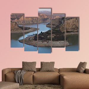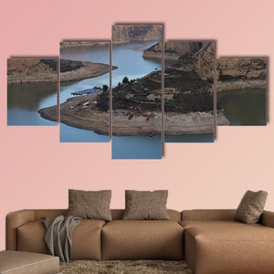 Yellow River Laoniuwan captures an aerial landscape: a calm lake dotted with small vegetated islands and steep, rocky hillsides. The blue, brown, tan and green palette and late-afternoon light create a serene, vast, natural mood that suits rustic or modern room decor.