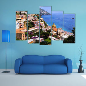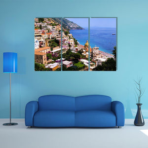 This vibrant canvas artwork captures a picturesque coastal town on the Amalfi Coast, featuring a sunny atmosphere. With its realistic depiction of cascading buildings, a charming yellow domed church, and serene boats on the water, it brings a peaceful touch to any space.