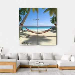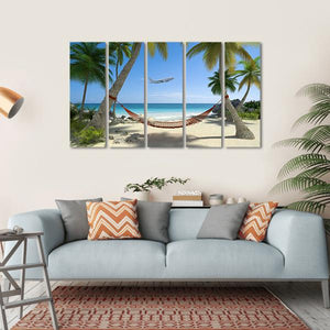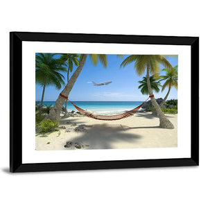 This canvas wall art captures a serene beach scene featuring a hammock gently swaying between palm trees. The vibrant blues and soft whites evoke a relaxing tropical atmosphere, perfect for bringing a vacation vibe to your space.